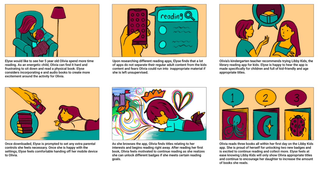 After interviewing 3 children we created the user persona Olivia. She is a 5 year old who is just starting kindergarten and likes to read when a book is given to her, but she’s not so motivated to choose one herself.