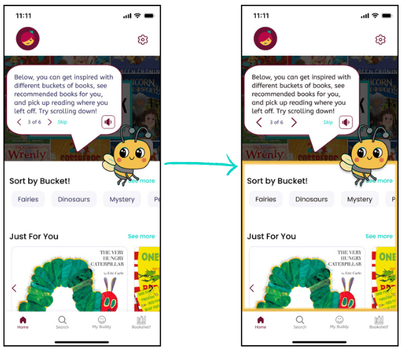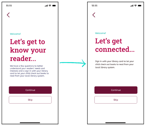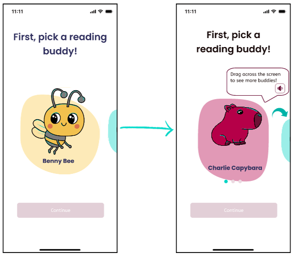 While the adults’ only task was completing onboarding, we asked the children to navigate through our prototype’s “Happy Path.” This consisted of getting started with the app as well as visiting their reading buddy to begin reading.