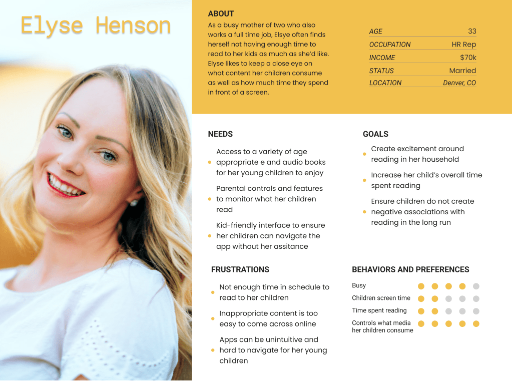After interviewing 3 parents we created the user persona Elyse is a busy working mom who doesn’t always have the time to read with her kids. She is looking for a way to allow her children read what they want too, but with parental control still in place.